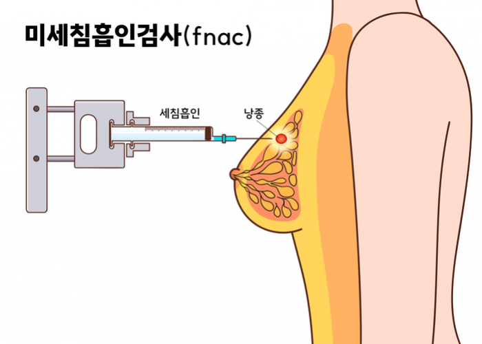 유방조직검사 란?| 미세침흡입 검사 | 가는 바늘(20-25게이지)을 병변 부위에 찔러 소량의 세포를 얻어 현미경으로 보아 암의 유무를 검사하는 방법입니다. 그러나 중심침생검(총 조직검사)에 비해 정확도가 떨어져 물혹의 경우에만 제한적으로 이용됩니다.