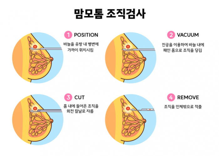 | 맘모톰 조직검사 | 미세침흡인 검사나 중심침생검(총 조직검사)에서 유방암이 아닌 것으로 확인되었으나 영상검사 소견과 맞지 않아 좀 더 많은 양의 조직이 필요하거나 미세석회화가 주를 이루는 병소에서 중심침생검(총 조직검사)만으로는 충분한 양의 조직을 얻기가 힘들다고 예상될 때 권고되는 조직검사 방법입니다.